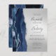 Le bord gauche de cette élégante invitation de mariage moderne présente une bordure d'agate aquarelle bleu marine agrémentée de faux éclats d'argent. Le texte personnalisable combine une écriture manuscrite grise charbon, des polices copperplate et italiques sur un fond de faux foil argenté. Le verso présente un motif assorti d'agate bleu marine et argent.