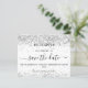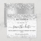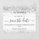 Un moderne et élégant Save the Date pour un mariage. Sur le devant un arrière - plan blanc décoré de faux parties scintillant. brille. Personnalisez et ajoutez une date et des noms. Le texte : Save the Date est écrit avec un grand script de style à la main tendance. Dos : un faux arrière - plan argenté