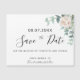 Une carte magnétique Save the Date moderne pour un mariage. Un arrière - plan blanc chic décoré d'une verdure d'eucalyptus vert aquarellée, de feuilles et de sprigs et d'une pivoine blanche aquarellée, fleurie. Personnalisez et ajoutez vos noms, la date et le lieu du lieu. Lettres de couleur noire. Le texte : Save the Date est écrit avec un grand script de style à la main tendance.