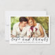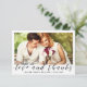 Merci à vos invités mariages dans le style avec cette photo moderne personnalisée merci carte à plat. Ce modèle de design simple mais élégant présente votre photo sur le devant bordée de blanc avec les mots "Amour et Merci" en script noir et vos noms avec date mariage à personnaliser. L'arrière de la carte postale a un message personnalisé et une signature accentuée par un coeur. Conçu par l'artiste Susan Coffey.