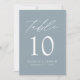 Cartes de numéro de table mariage tendance et minimaliste avec lettrage blanc avec "Table" dans le script de calligraphie moderne. Le design est composé d'un arrière - plan bleu poussiéreux ou d'une couleur de votre choix. Le dessin se répète à l'arrière. Pour commander les cartes de table : ajoutez votre nom, votre date de mariage et votre numéro de table. Ajoutez chaque numéro à votre panier individuellement et retirez-le lorsque vous avez terminé.