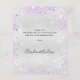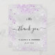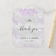 Une carte de remerciement de mariage. Une couleur de fond métallisé argenté faux. Avec de la poussière de paillettes violette fausse. Sur le devant, un grand script lettrage à la main et le texte : Merci, vos initiales de monogramme, noms et une date.