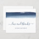 Carte de remerciements moderne budget avec un design simple avec un trait bleu marine d'aquarelle artistique en haut avec les mots "amour et merci" dans un script manuscrit avec des swashes et vos noms dans une police sans serif, sur un arrière - plan blanc. L'envers a votre message personnel. Ce carte de remerciements non photo est idéal pour un couple marié qui veut des cartes de remerciement sans photos.