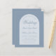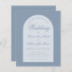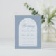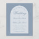Une faire-part de mariage moderne. Sur un arrière - plan bleu poussiéreux, il y a une arche blanche avec du texte bleu poussiéreux. Le mot Mariage et les noms sont écrits dans un élégant script calligraphique, la première ligne est du texte arché.