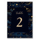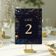 Guidez vos invités à leurs sièges sous un ciel étoilé avec ce numéro de table de mariage céleste boho. Doté d'un ciel bleu marine luxueux, d'étoiles dorées chatoyantes et d'un élégant script moderne, cette carte double face apporte une touche romantique et rêveuse à votre réception de mariage. Parfait pour les mariages célestes, boho et étoilés. Le design recto verso en fait un lieu idéal pour les fêtes en plein air, les réceptions en mariage de automne et les soirées romantiques.
