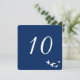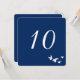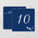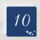 Conception de carte de numéro de table simple et élégante entièrement personnalisable. Le vol d'oiseaux est blanc et a un fond transparent afin que vous puissiez changer la couleur d'impression du papier pour qu'elle corresponde au thème de votre événement. Toutes les zones de texte peuvent être personnalisées. Le fond bleu par défaut est idéal pour les mariages côtiers ou les mariages juifs.