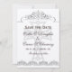 Mariage à thème croisé enregistrer les cartes de date disposent d'une croix avec des bordures de calligraphie et plusieurs champs de texte que vous pouvez customiser avec vos détails personnels sur le devant tandis que le dos a un motif damassé en noir et marron.