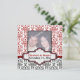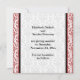 Faire-part de mariage personnalisé damas noir blanc rouge Save the Date. La partie supérieure est ornée d'un motif damas rouge et blanc et la partie inférieure est en noir et blanc. Une bande rouge sépare les deux parties. Votre texte est saisi sur une étiquette élégante avec un contour blanc et rouge.
