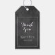 Un mariage en tableau noir vous remercie de vous avoir accordé des étiquettes cadeaux. texture vintage en tableau noir présente des étiquettes pour la fête de mariage ou la douche nuptiale. Créez vos propres étiquettes personnalisés avec le nom ou le monogramme et la date du mariage. Joli design rétro avec élégante typographie de script pour message de remerciement, nom de mariée et mariée / couple marié récemment. Impression double face classique pour cadeau élégant comme bonbons et bonbons, champagne, vin ou bouteilles d'eau, etc. Comprend une jolie chaîne grise. Couleurs arrière - plans personnalisables. Beau thème rustique pour remercier les clients. Merci de partager notre journée spéciale ! Faites-les pour les demoiselles d'honneur, la servante d'honneur, le matron d'honneur, les groomsmen, la mère de la mariée, les invités, la famille etc. Comprend une police en lettres décontractées et une petite ligne de bordure tracée à la main. Accessoires do-it-yourself tendance pour fêtes et événements festifs. Style de lettrage manuscrit.