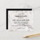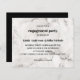 NOTEZ : LES ENVELOPPES NE SONT PAS INCLUS Une invitation simple et élégante à la fête d'engagement pour les couples modernes présente un arrière - plan marbré blanc et gris étonnant. Les détails de votre soirée sont affichés gracieusement sur la droite, dans une combinaison chic de caractères gras et serif dans classique off-black. Carte inversée dans une couleur noire contrastée avec de la place pour du texte supplémentaire comme le registre, le site Web, hébergé par ou d'autres informations utiles. Très facile à customiser en utilisant le modèle. VEUILLEZ NOTER QUE LES ENVELOPPES SONT INCLUSES.