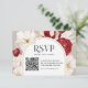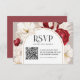 Une carte RSVP moderne conçue avec élégance et dotée d'un code QR scannable pour des réponses rapides et faciles. Accentué de roses rouges rubis et de fleurs blanches douces pour correspondre à votre suite d'invitation.