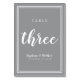 Ce design a été créé pour des célébrations mariages intimes plus petites. Simple, minimaliste et élégant Numéro de table de mariage Le design TROIS présente un design contemporain avec une bordure double en blanc immaculé sur un arrière - plan gris Ultimate. Le design est chic et intemporel. Personnalisez la conception de table mariage avec vos détails mariages en lettres et en script blancs. Le dos de la carte est un double de l'avant. Commandez-en une pour chaque table avec les numéros de table individuels. Les tables ONE à TEN sont conçues individuellement et sont disponibles dans notre magasin InvitationSuites sur Zazzle. Bien qu'il soit spécialement conçu pour un lieu plus petit, si vous avez besoin de numéros supplémentaires, envoyez-nous un courriel à InvitationSuites@gmail.com .