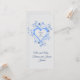 Une petite carte de souvenir mariage à placer à chaque table pour plaire aux clients. Il express l'appréciation de la fiancée et du marié pour leur présence. Le design est un cadre de coeur romantique avec le nom du couple mariage à l'avant. Le coeur ouvert est bleu ciel. Le coeur est soigneusement décoré avec deux fleurs différentes. La plus grande fleur pétalée est bleu pâle. La plus petite fleur en forme d'étoile est bleue royale. Il y a de l'herbe courbée gracieuse dans de jolis tourbillons avec de minuscules feuilles. Le texte à l'arrière a un message de remerciement. Vous pouvez supprimer le coeur sur le dos et télécharger une photo du couple si vous voulez. Vous pouvez modifier tout le texte pour le personnaliser. La couleur arrière - plan peut également être changée. D'autres objets avec ce design sont également disponibles dans la collection "Love" de mon magasin.