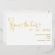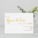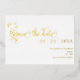 Cette invitation de mariage romantique de luxe avec une calligraphie à fioritures vintage "Save the Date" avec feuille d'or champagne est simple et polyvalente. Elle présente un design luxueux en feuille d'or, avec les noms des mariés et un texte formel modifiable sur le devant. Au verso, veuillez télécharger une photo du couple.