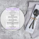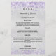 Une carte élégante et séduisante pour les mariages. Personnalisez et ajoutez vos noms, votre date et le menu mariage. Arrière - plan à l'aspect argent faux, décoré de violet, lavande confetti.