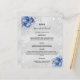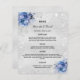 Un menu mariage élégant et glamour. Personnalisez et ajoutez vos noms, votre date et le menu mariage. Faux arrière - plan d'apparence argentée, décoré avec de la poussière de parties scintillant imitation et des fleurs bleues.