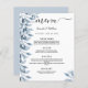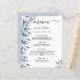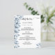 Une carte de menu mariage élégante et tendance. Floraux botaniques de couleur bleu, feuilles et sprigs. Personnalisez et ajoutez vos noms, votre date et le menu mariage. Un arrière - plan blanc chic. Lettres de couleur noire. Le mot Menu est écrit avec un script de style de lettres à la main moderne avec des swashes. Dos : un arrière - plan gris bleu clair.