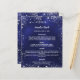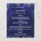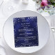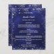 Un menu mariage classique. Un arrière - plan bleu marine, décoré de parties scintillant faux argentées brille. La couleur bleue est inégale. Texte blanc. Personnalisez et ajoutez votre nom, votre date et le menu. Vous pouvez ajouter du texte, des photos à l'arrière. 1 feuille = 1 menu imprimé bord à bord.