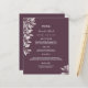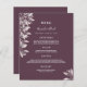 Une carte de menu mariage élégante et tendance. Floraux botaniques duveteux de couleur rose, feuille. Modèles pour vos noms, date et le menu mariage. Un châssis chic, arrière - plan violet profond. Lettres de couleur blanche. Retour : arrière - plan couleur cassis.