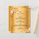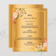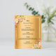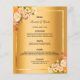 Une élégante carte de menu mariage de style bohème. Roses roses dorés et verdoyants comme décor. Modèles pour vos noms, date et le menu mariage. Un cadre en faux or et un arrière - plan métallique en faux or. Lettres gris foncé. Dos : faux or arrière - plan à l'apparence métallique.