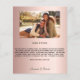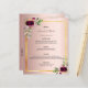 A l'avant : Une élégante carte de menu mariage de style bohème. Plumes et roses luxuriants en bordeaux. Personnalisez et ajoutez vos noms, votre date et le menu mariage. Un cadre en faux or et un cadre en faux or rose chic en faux fond métallique. Lettres gris foncé. Retour : arrière - plan de couleur or rose, votre photo et ajouter votre histoire d'amour ou des faits amusants. Donnez aux gens quelque chose dont il faut parler en attendant que la nourriture soit servie !