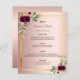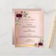 Une élégante carte de menu mariage de style bohème. Plumes et roses luxuriants en bordeaux. Modèles pour vos noms, date et le menu mariage. Un cadre en faux or et un cadre en faux or rose chic en faux fond métallique. Lettres gris foncé. Retour : arrière - plan rose couleur or.