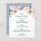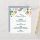 Une carte de menu mariage, élégante et romantique. Des roses de couleur pastel, des fleurs blanches, roses rousses et quelques raisins gris bleus. Modèles pour vos noms, date et le menu mariage. Arrière - plan blanc à l'avant, gris bleu à l'arrière. Lettres vertes.