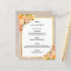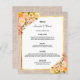 Une élégante carte de menu mariage de style bohème. Roses roses dorés et verdoyants comme décor. Modèles pour vos noms, date et le menu mariage. Un cadre en faux or et blanc et un burlap rustique en arrière - plan. Lettres gris foncé. Retour : un burlap beige rustique en arrière - plan.