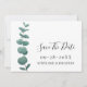 Informez votre famille et vos amis de la date de votre mariage avec cette carte de mariage minimum enregistrer la date. Il présente l'aquarelle eucalyptus et la typographie stylisée. Facile à personnaliser. Aquarelle originale © Michele Davies.
