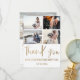 Carte de remerciement de mariage minimaliste moderne. Caractérisée par une grande calligraphie élégante en feuille d'or fausse et des espaces pour ajouter 4 de vos photos de mariage spéciales. Facile et amusant à personnaliser pour créer vos propres cartes de 'Remerciements' uniques.