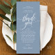 Partagez l'amour et montrez votre appréciation à vos invités, quand ils s'assoient à leur siège et lisent cette carte de remerciement personnalisée et charmante. C'est une façon merveilleuse de commencer votre fête spéciale ! Cette carte vous donnera le ton pour un événement inoubliable. La carte de remerciements est décorée dans un style moderne, dans un style bleu poussiéreux intemporel, ajoutant une touche d'élégance intemporelle à votre célébration. Conçu par TeeshaDerrick