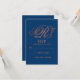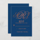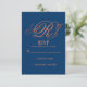 Cette élégante carte RSVP a un monogramme entrelacé en caractères de script dans les tons de cuivre sur un arrière - plan bleu marine. L'arrière est en bleu marine.