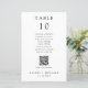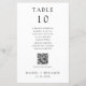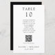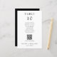Carte simple et minimaliste de numéro de table de mariage noir et blanc avec nom d'invité, tableau de sièges et code QR personnalisé pour le menu mariage