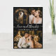 Élégant minimaliste noir et blanc Merci photo Mariage plié à la main. Modèle de mariage élégant avec trois (3) photos sur le devant et une (1) photo à l'intérieur. Avec le texte "Amour et merci" dans une jolie police de script de typographie lettrée main avec des swashes en couleur blanche sur l'arrière - plan noir. Ajoutez votre nom et un message de remerciement. Petit coeur entre les noms. Si vous préférez écrire votre note à la main, supprimez simplement l'exemple de texte pour gagner de l'espace. Si vous avez besoin d'aide, veuillez contacter le concepteur !