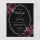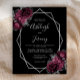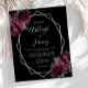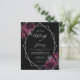 Cette élégante faire-part de mariage moderne présente un cadre géométrique argenté orné de fleurs bordeaux et argentées sur un arrière - plan noir. Le texte personnalisable combine écriture fantaisie gris argenté, cuivre et polices italiques. L'envers est noir solide.