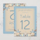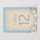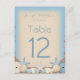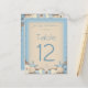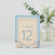 Un beau numéro de table de mariage de destination avec un thème exotique de plage. Un joli arrière - plan de texture de sable dans les tons crème et bleu marine est parsemé de nombreux petits galets de plage. Au-dessus des galets se trouvent des coquillages, des oursins, des étoiles de mer et des perles.