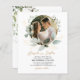 Décor avec aquarelle verte eucalyptus avec bordure parties scintillant dorée fleurie avec photo. En utilisant une police de calligraphie élégante en couleur or pour le nom de la mariée et du marié qui le fait ressortir.