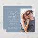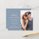 Un mariage bleu poussiéreux et économique sauvez le faire-part de date avec votre photo et "Happily Ever After" dans un mélange de typographie blanche moderne simple et un script blanc élégant avec des swashes. Personnalisez votre enregistrement des détails de la date et ajoutez vos noms dans un script de type signature. Vos noms et votre date de mariage sont réunis par un coeur sur le dos.