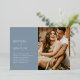 Donnez vie à votre mariage de rêve avec des invitations minimalistes de mariage photographique! Ces invitations élégants et modernes disposent d'un arrière - plan bleu poussiéreux vintage avec une photo à l'avant et à l'arrière que vous pouvez facilement remplacer par la vôtre. Pour les rendre plus spéciales, elles sont équipées d'un modèle de texte en feuille de papier avec tous vos détails mariages, ce qui rend ce design unique vraiment unique. Assurez-vous que votre mariage se démarque de la foule avec ces invitations photo minimalistes ! Avec leur look moderne et intemporel, vos invités seront ravis par le luxe subtil que chaque invitation offre. Vous pouvez être sûr que vos invités seront impressionnés par la qualité de ces belles invitations de mariage.
