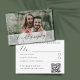 Voici notre carte de réponse RSVP, conçue avec une touche personnalisée pour rendre votre planification mariage transparente. Cette carte sophistiquée comprend votre photo customisée, en ajoutant un élément personnel et chaleureux. Les touches vert sauge apportent une touche d'élégance naturelle, complétant parfaitement le design simple mais élégant. Il s'agit d'un code QR pratique qui relie directement vos données de mariage, ce qui facilite la réponse de vos invités et l'accès à des informations importantes. Cette carte RSVP allie fonctionnalité et beauté, afin que vos invités puissent partager sans effort votre journée spéciale.