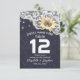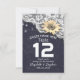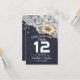 Place de siège mariage / Numéro de table / Carte d'escorte Modèles - Fleurs de soleil élégantes, cadre en dentelle Vintage et lumières à cordes chic sur Arrière - plan bleu marine. Un design parfait pour votre grand jour. Tous les styles de texte, couleurs, tailles peuvent être modifiés selon vos besoins !