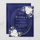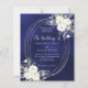 Un arrière - plan bleu et inégal. Un cadre ovale en faux argent décoré de fleurs blanches aquarellées, rose. Personnalisez et ajoutez vos noms, détails. Texte blanc. Retour : ajoutez votre URL de site Web au code QR pour RSVP et/ou plus de détails. 1 feuille = 1 invite imprimé bord à bord.