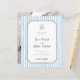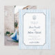 Cette invitation de mariage fantaisiste présente un cadre dessiné à la main bleu marine sur un fond rayé bleu clair. En haut de l'invitation, il y a une illustration griffonnée d'un anneau de diamant dans une boîte à bague en coquillage. Les détails suivent avec les noms des mariés dans un lettrage script charmant. Idéal pour les thèmes de mariage estivaux, italiens, de plage, de yacht et côtiers. Les cartes se retournent sur une photo de fiançailles de votre choix. Modifiez la plupart des mots et des couleurs du texte pour que cette douce invitation de mariage corresponde à vos besoins et à votre style personnel. Dans le cadre de la sélection budgétaire de Zazzle, cette feuille n'est pas disponible en formats de carte standard. Pour obtenir ce design sur une carte standard, vous pouvez le trouver dans la collection ou utiliser la machine Zazzle Make pour le transférer sur votre produit préféré. Consultez la collection liée sur cette