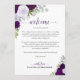 Ces belles cartes sont conçues pour accueillir vos invités et les membres spéciaux de votre mariage. Le design rustique boho chic comprend des roses peintes à la main à l'aquarelle, des feuilles d'eucalyptus et de la verdure de jardin dans des nuances de violet, prune et lavande. Le devant comporte un espace pour un message de bienvenue, et au dos figure le programme ou l'itinéraire. Excellent ajout à un sac d'accueil de mariage, et une merveilleuse façon de remercier vos invités de célébrer avec vous !