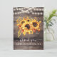 Un tournesol rustique et des lumières à cordes brillantes sur le bois avec typographie script mariage merci cartes. L'élégance rustique moderne.