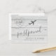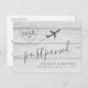 Annonce de report de mariage de destination de plage pour informer vos invités que le lieu ou la date de votre mariage (ou les deux) doivent être modifiés ou reprogrammés en raison des restrictions de voyage. Modifiez la formulation comme vous le souhaitez ou conservez notre explication subtile du coronavirus. Le fond texturé en planches de bois gris et blanc sur le thème de la plage et notre logo de monogramme d'avion unique à l'intérieur d'une police de caractères calligraphiée moderne contient vos initiales. Visitez la boutique de conception Zazzle de Paper Grape Destinations pour plus d'invitations de mariage, de dates à sauvegarder et d'annonces de report sur le thème des voyages et de la plage.