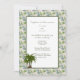 Un beau cadre de Feuilles de palmiers verts, roses et Turquoises avec un contour vert foncé et un texte vert pour votre mariage tropical sur une île au soleil