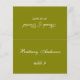 Une simple carte de mariage vert olive avec le nom de l'invité et le numéro de table imprimé à l'avant et le nom de la mariée et du marié et la date du mariage imprimé sur l'autre côté (c'est l'autre moitié, avant de la plier). Tout le texte est blanc. Taille : 4,5 po x 5,6 po avant pliage, soit 4,5 po x 2,8 po après pliage.