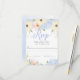 Bouquet de fleurs printanières douces aux roses roses roses, hydrangées bleues, fleurs violettes et jaunes sur un arrière - plan bleu aquarelle. Élégante typographie de script moderne avec éléments tourbillonnants délicats. Les tons pastel doux jaune, bleu et rose sont les couleurs principales de cette suite mariage.