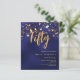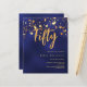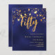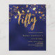 Une invitation moderne et élégante pour une fête du 50e anniversaire pour lui et elle. Décoré d'étoiles dorées. Arrière - plan bleu marine et le mot Cinquante écrit avec de grandes lettres en faux or. La couleur bleue est inégale. Personnalisez et ajoutez un nom et des détails du parti. 1 feuille = 1 invite imprimé bord à bord.